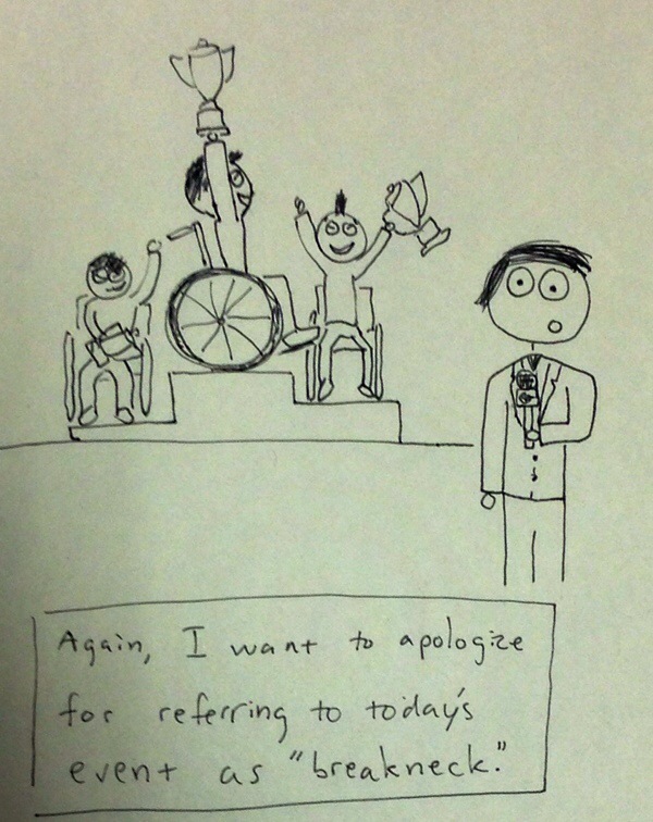Actual racing wheelchairs are way harder to draw. July 10, 2014 by Bob Share this: Click to share on X (Opens in new window) X Click to share on Facebook (Opens in new window) Facebook Like Loading... Related